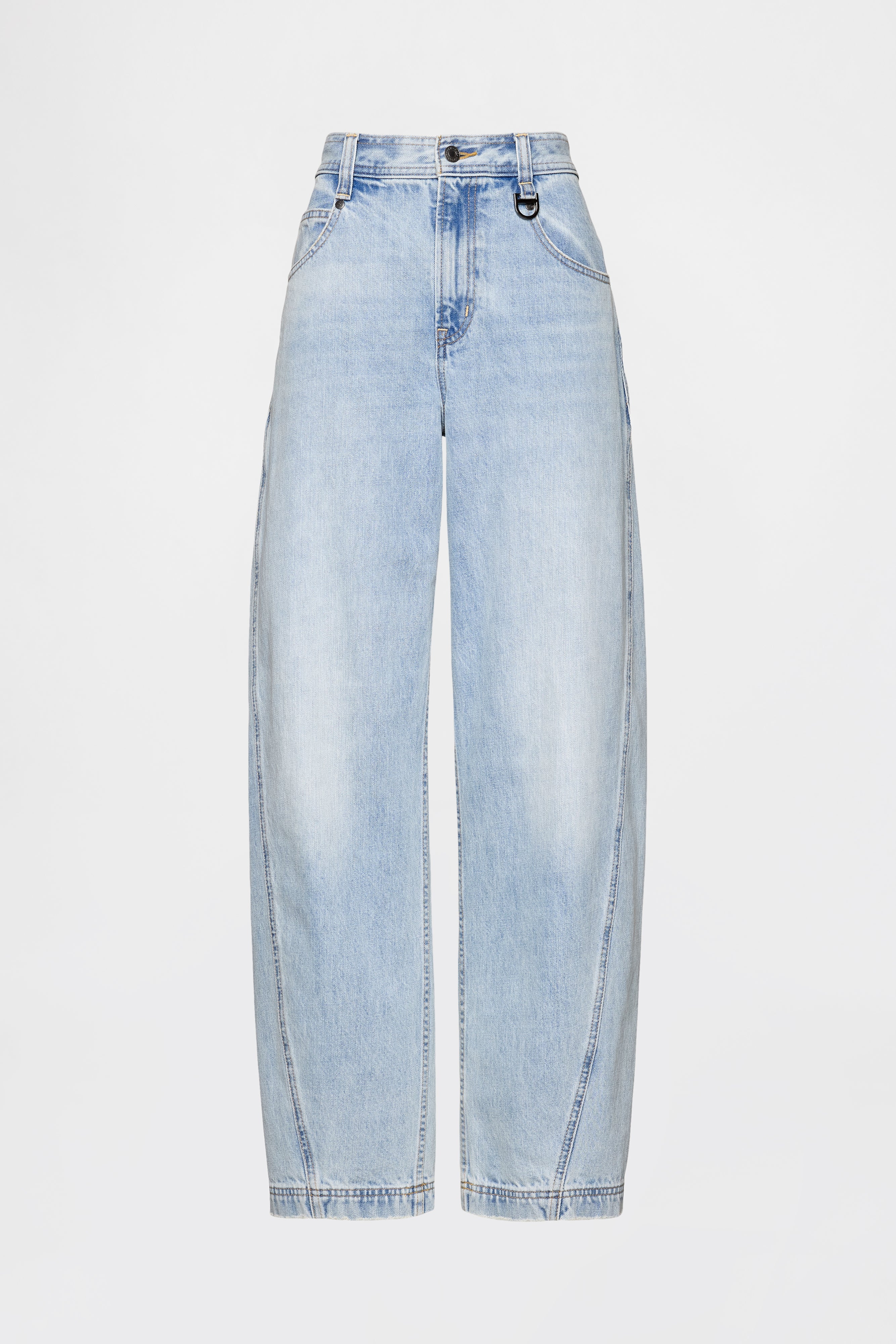 Look: A classic five-pocket barrel jean in a light washl